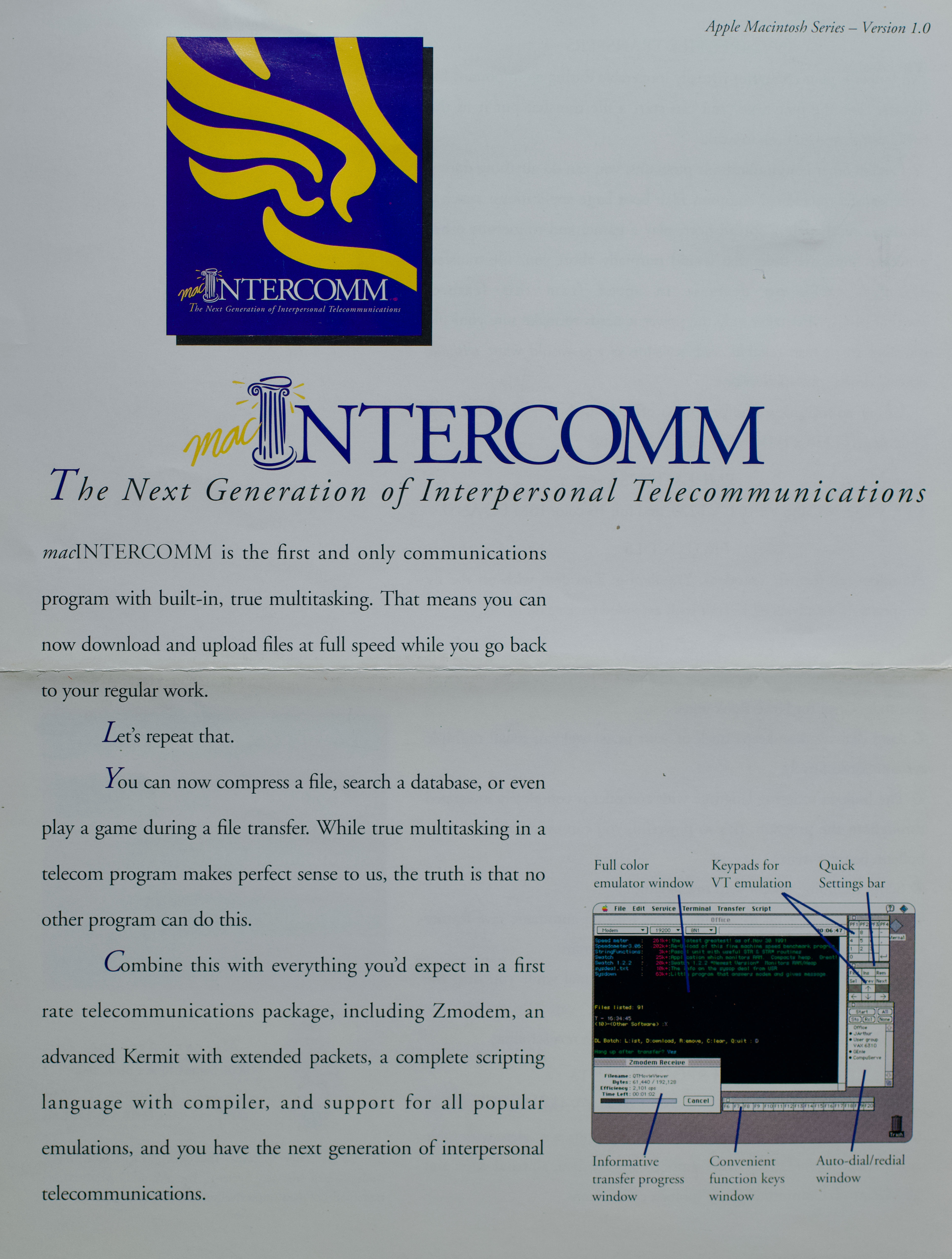 MacIntercomm is notable for, among other things, keeping in-progress file transfers running even during interrupt time — solving the age-old problem of holding down a menu cancelling your downloads. The ambition is bigger: MacIntercomm is intended to evolve into a next-generation BBS. But both Will and Mark are in college, and the full vision doesn't materialize before the web changes everything. MacIntercomm is sold to New World Computing in 1994.